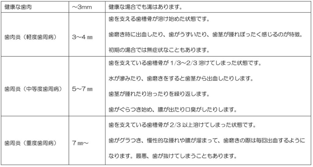 健康な人でも歯周ポケットはありますが、歯と歯茎がぴったりくっついて浅いです。しかし、歯周病になると歯周ポケットが次第に深くなっていくのです。