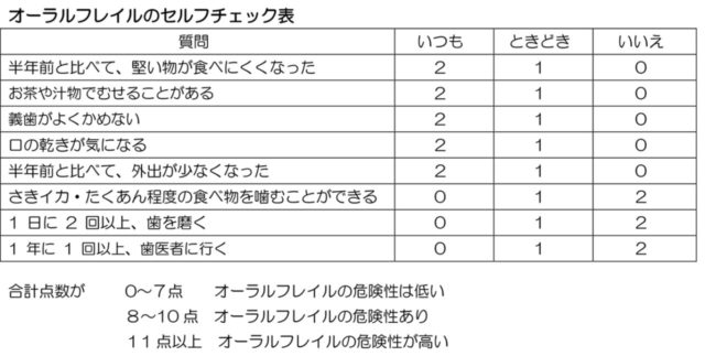 「オーラルフレイル」は、口腔機能の軽微な低下や食の偏りなど、身体の衰え(フレイル)の一つです。お口のささいなトラブルを「年のせい」と諦めて放っておくと、自覚がないままに悪循環に陥ってフレイルからサルコぺニア(※加齢や疾患により、筋肉量が減少すること)、要介護状態、死亡にいたるリスクが高まるのです。下の表で、合計点数が 9 以上の方はオーラルフレイルの危険性があります。放置せずに早めに当院へご相談ください。