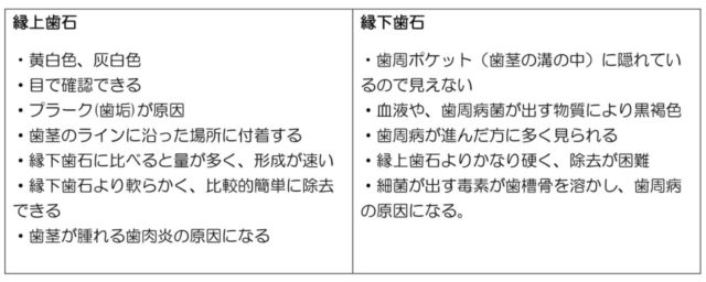 歯石は、歯肉より上の部分にふちゃくしている歯石(歯肉縁上歯石)と、歯肉より下の部分(歯肉の中の歯の周りに付着・歯肉縁下歯石)に付着している歯石があります。